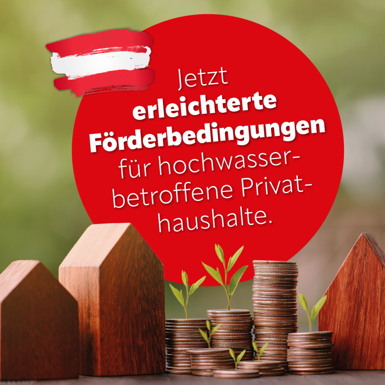 Aufgrund der aktuellen Hochwasserereignisse 2024 und den damit verbundenen außergewöhnlichen finanziellen Belastungen für Betroffene gelten in den aktuellen Förderungsprogrammen der Sanierungsoffensive und dem Energieeffizienzprogramm „Tausch erneuerbarer Heizungssysteme“ für Ein-/Zweifamilienhäuser und Reihenhäuser vereinfachte Förderungsbedingungen.