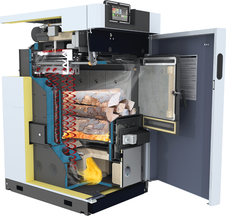 The S1 Turbo (15 – 20 kW) combines all the features of a state-of-the-art biomass combustion system. The speed-regulated induced draught fan ensures constant high quality combustion, and the carbonisation gas extraction system prevents flue gas from escaping, even when topping up. The new S1 Turbo stands out for its high efficiency and long refilling intervals, as well as its low emissions and low energy consumption. The new air duct concept in Froling’s S1 Turbo firewood boiler automatically regulates the heating, primary and secondary air with a single actuator. Thanks to the special air ducts for pre-heating, the fuel loading chamber door can be closed very soon after lighting. Heating with firewood can be that convenient!
