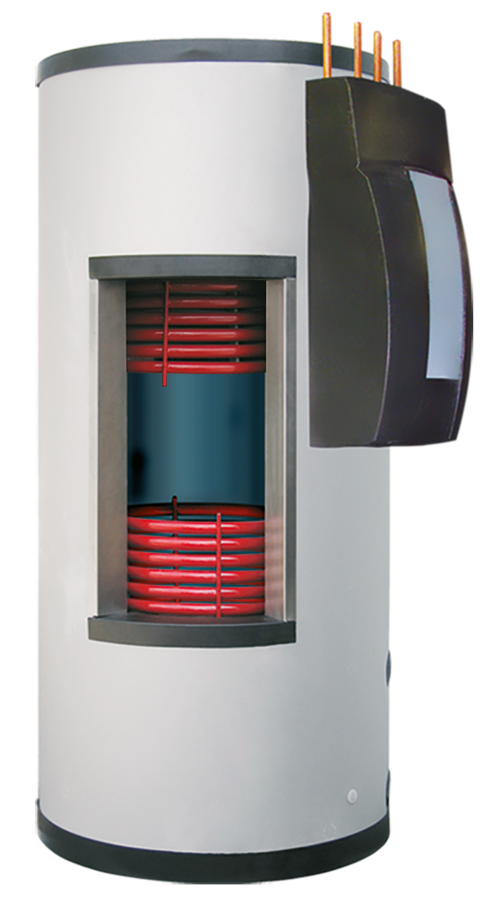 Skikttank, varmvattenberedare och skikttank för solvärmesystem i en och samma produkt. Även den här kraftfulla ackumulatortanken arbetar med genomströmningsteknik som ger legionellasäker varmvattenberedning.