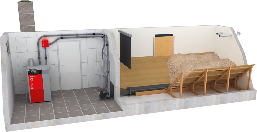 Frölings pelletssugskruvsystem är den perfekta lösningen för stora och avlånga bränsleförråd upp till 10 m.