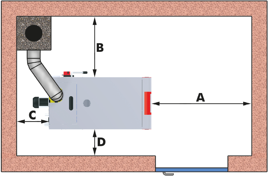 ¹ På den sida där VOS-spaken är monterad (B eller D) ska pannan ställas upp minst 800 mm från vägg, så att den är lätt åtkomlig för anslutning av aggregatet och för underhållsarbeten (t.ex. på sugfläkten).